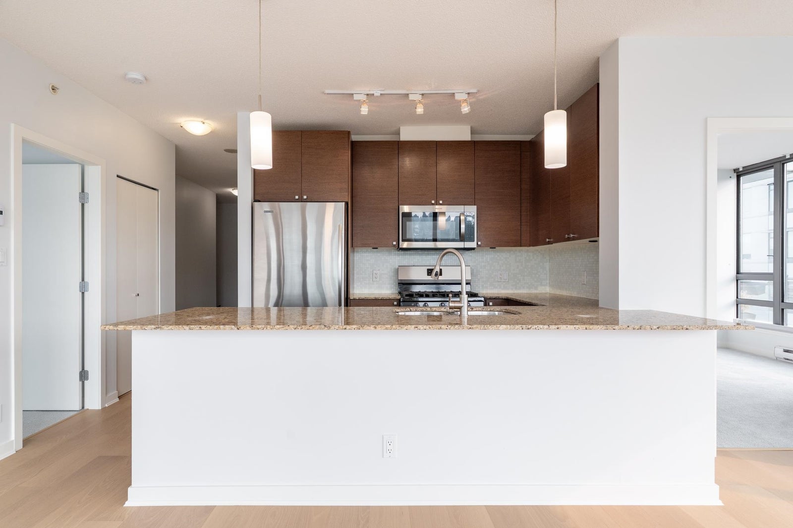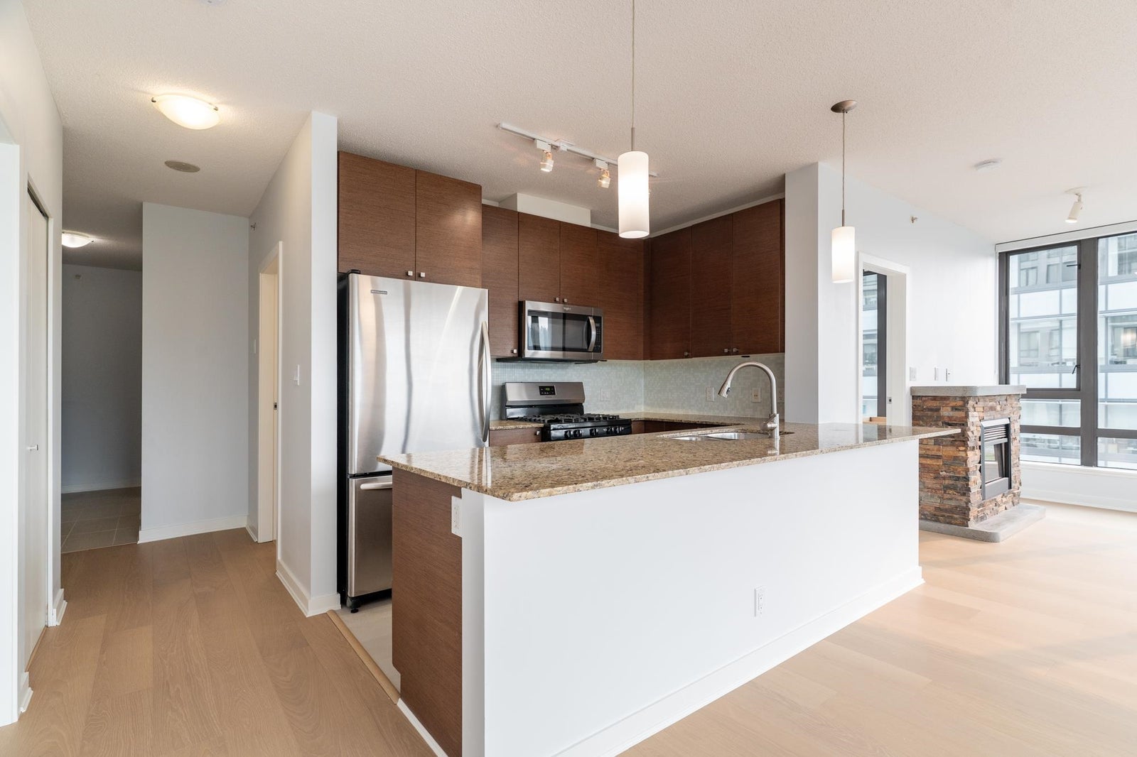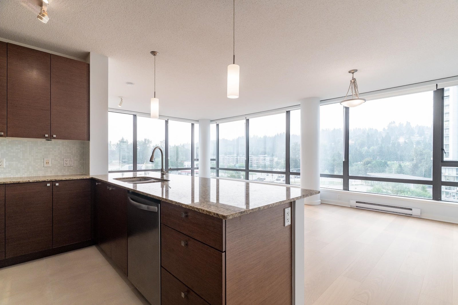 Aria II in vibrant Suter Brook! This bright 2 bed, 2 bathroom, 1078 sqft, corner unit boosts floor to ceiling windows with an open concept. The kitchen is equipped with stainless steel appliances, granite countertops, and peninsula perfect for entertaining. It's freshly renovated which includes stunning engineered hardwood flooring, carpet, modern roller blinds, and new paint. All the amenities are in the building including indoor pool, fitness centre, squash court, steam room, sauna, hot tub, yoga room, and theater. Out the main door to cafes, restaurants, shops all within the village. Steps away from Rocky Point, Inlet Centre Station, Rec Centre, and Newport Village. One parking. Easy to show!