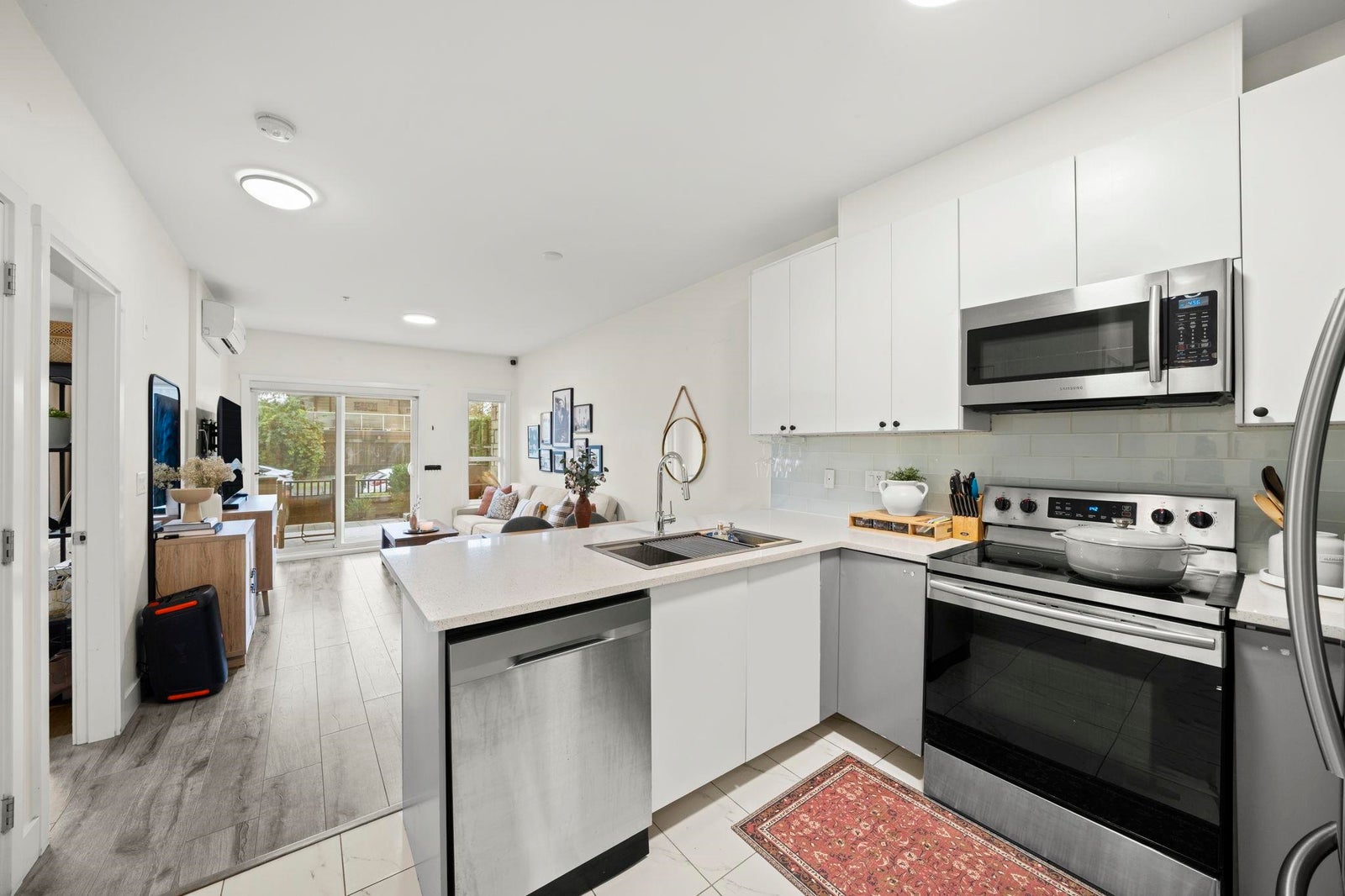 Welcome to The 222, a beautifully maintained and modern 1-bedroom, 1-bathroom condo in the heart of Maple Ridge. This bright and open-concept home features contemporary finishes throughout, including quartz countertops, stainless steel appliances, and modern cabinetry. Stay comfortable year-round with built-in air conditioning. Spacious living and dining area flows seamlessly to your private ground-level patio, perfect for morning coffee or relaxing outdoors. The large bedroom offers ample closet space, and the bathroom showcases elegant tile work and modern fixtures. In-suite laundry, secure underground parking, and storage locker. Conveniently located near shopping, schools, transit, and parks. Open House Saturday October 25th & Sunday October 26th, 2:00 - 4:00 PM both days.