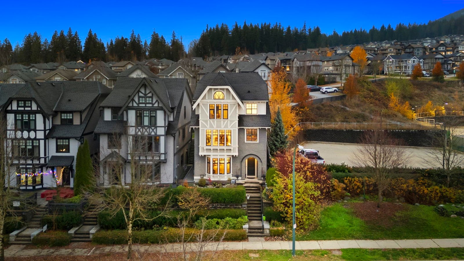 Beautifully maintained Burke Mountain home by Mosaic with lane access and valley views. Three-level Tudor-inspired design with over 3500 sq.ft., 5 beds and 4 baths. Main floor features 9' ceilings, an expansive chef-style kitchen with large quartz island, stainless appliances, and a spacious living area with room for office or play space. Walk-out patio off kitchen with mature landscaping. Upper level has a large primary suite with organized walk-in closet, valley outlook and spa-style ensuite. Lower level includes a high-end legal one-bed suite with potential to convert to two beds. Extra parking off rear lane suitable for larger vehicles. Steps to Coast Salish, transit and parks. New middle and high school coming 2026.
